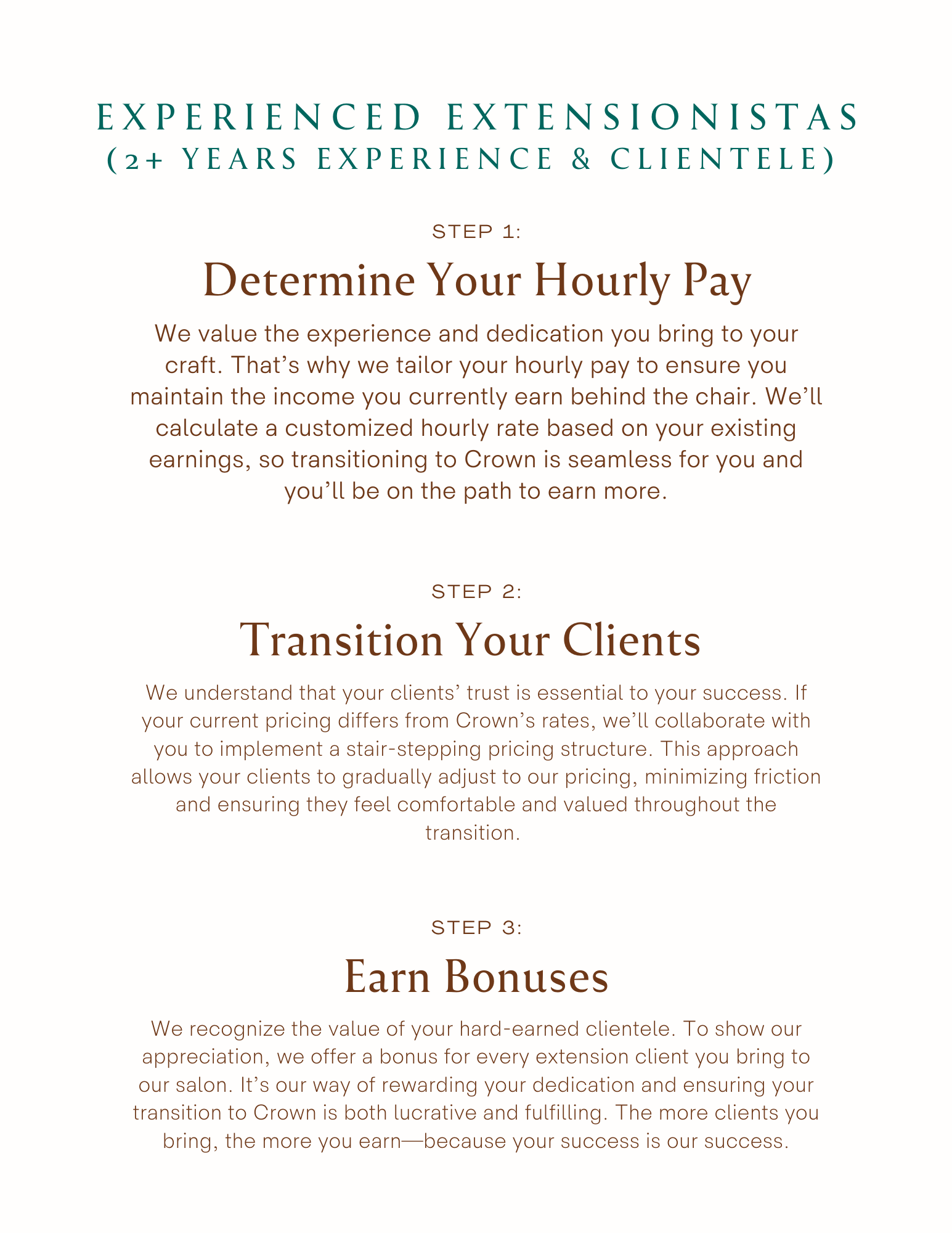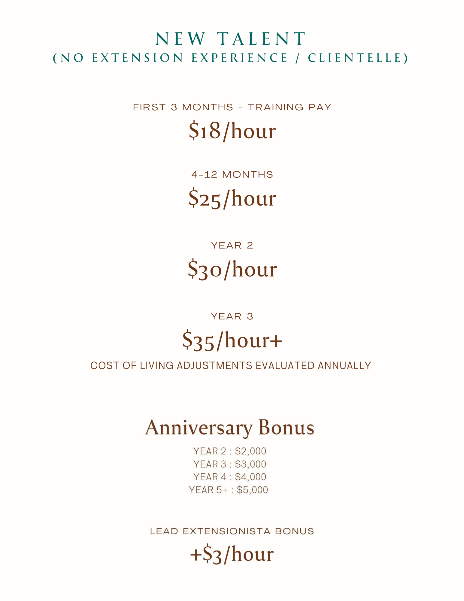 FOR EXPERIENCED EXTENSIONISTAS WITH CLIENTELE : You will be given a custom hourly rate and career map to ensure your take home pay is comparable to your current earnings and you will have the opportunity to earn bonuses for clientele you bring in. Contact us to learn more!
