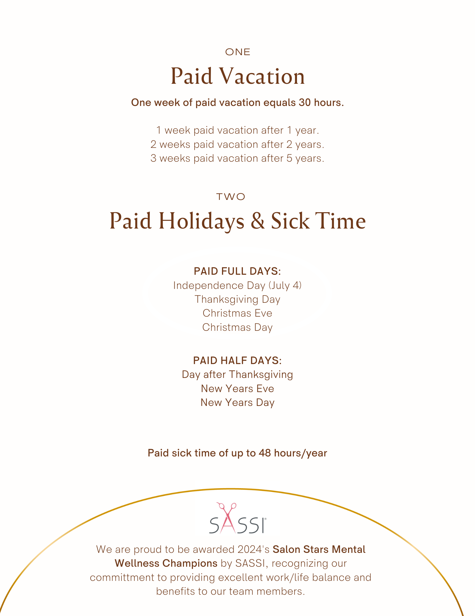 We believe in work- life harmony. Our team-based approach makes taking time off easy and we also offer paid vacation. Our 4 day work week is also dreamy! Plus, we provide all of the salon clientele, so you don’t have to worry about marketing yourself or even think about work on your off-hours.