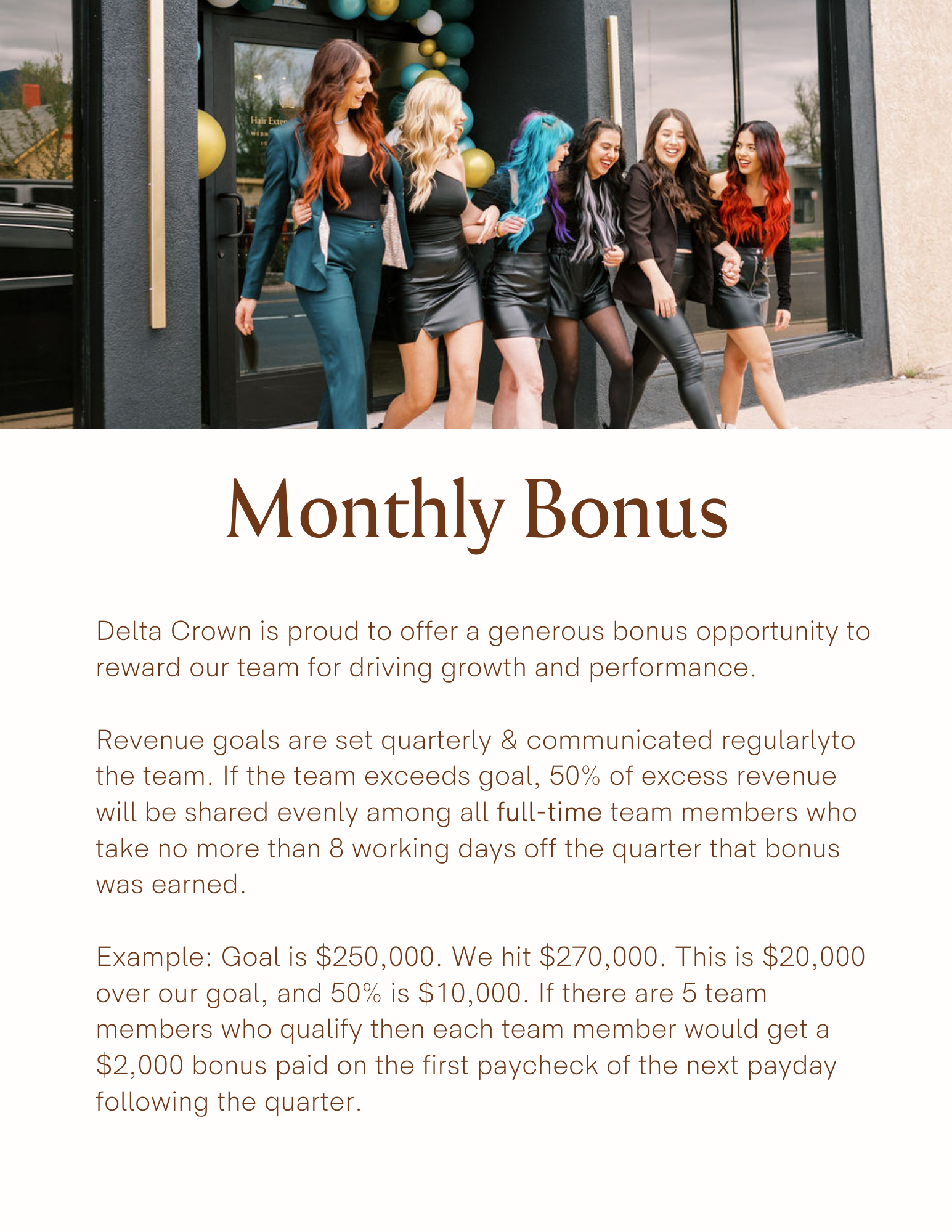 “Hey, Jenna here! I started Crown in 2017 with a dream of uplifting and creating more respect for the salon industry by changing the way hairstylists are compensated and cared for. I wanted to revolutionize the hair extensions industry by creating a repeatable blueprint for a customer journey in a collaborative, team-based environment. I wanted to provide a wealthy life for my extensionistas: financial wealth, relational wealth with coworkers, and freedom of time wealth. I want my extensionistas to see a future for themselves and a career path they can be excited about within Crown.